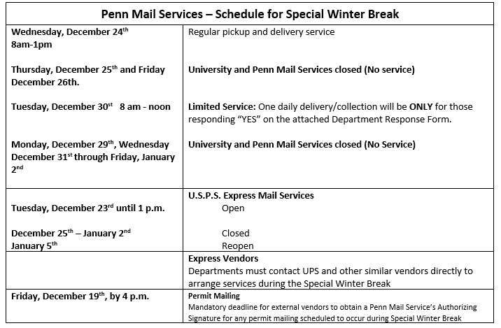 During the University's Special Winter Break, Penn Mail Services will operate on a limited basis.